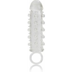 étui à pénis avec formes stimulantes - transparent Élevez vos performances érotiques ! Le rehausseur de soutien est facile à utiliser, confortable à porter et glisse pour une sensation instantanée. L'ajustement intensifie la stimulation. Partagez le plaisir et comblez tous les désirs de votre amoureux. La rallonge de support d'anneau sensuelle est fabriquée à partir de TPR doux, extensible et sans parfum. Toute la longueur de la manche translucide est texturée avec des rangées et des bosses pour une extase époustouflante. La rallonge a une pointe arrondie douce et un anneau élastique en boucle et sûr . Pour augmenter le plaisir et prolonger l'intégrité de l'anneau, utilisez toujours du lubrifiant. L'extenseur est parfait pour augmenter la taille et ajouter quelque chose de nouveau à la chambre. Explorez vos fantasmes les plus fous avec l'extenseur polyvalent conçu pour un plaisir partagé intensément satisfaisant. Avant et après utilisation, nettoyez la housse souple transparente avec un spray nettoyant pour jouets ou de l'eau chaude savonneuse. Longueur totale : 14 cm Diamètre : 3 cm Matière : Caoutchouc thermoplastique